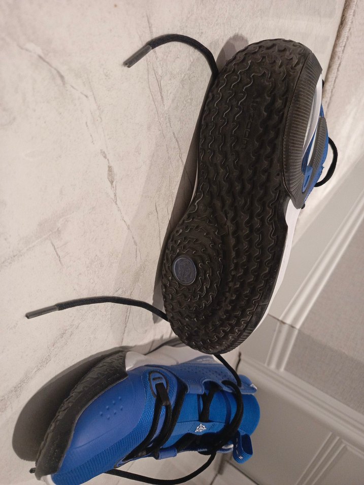 Koyu mavi renkli, kauçuk tabanlı ve Velcro bantlı basketbol ayakkabısı. Spor ve sokak stiline uygun, trend belirleyiciler için ideal.