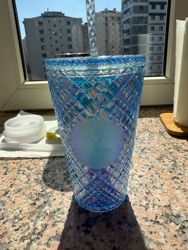 Işıltılı mavi renkte, dokulu elmas desenli Starbucks bardak ve uyumlu pipet. Tekrar kullanılabilir, şık ve kullanışlıdır.