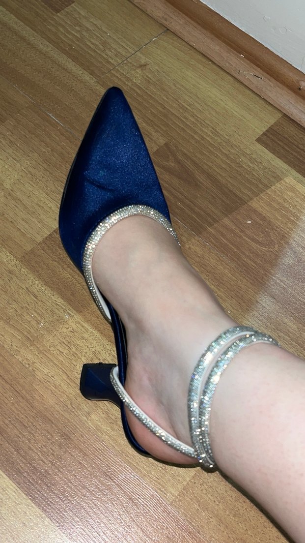Parlak mavi saten kumaştan, klasik stilettolu ve tokalı kayışlı kadın topuklu ayakkabı 9 cm topukludur 37 numaradır 2 kez giyildi yalnızca gösterdiğim yerlerde az bir taşı düşmüştür ama belli olmuyor