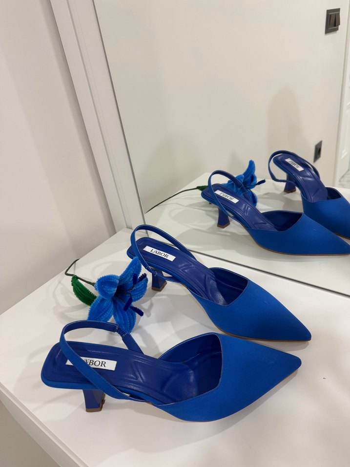Mavi stiletto topuklu abiye ayakkabı. Parti için çağdaş ve renkli bir tercih, 39 numara 5 cm topuğu vardır