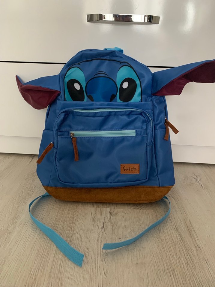 Koyu mavi renkli, Stitch karakterli çocuk okul çantası. Büyük kulaklar ve önünde fermuarlı cep bulunur. Yumuşak malzemeli, kahverengi tabanlı. Yeni hiç kullanımadı sorunsuz