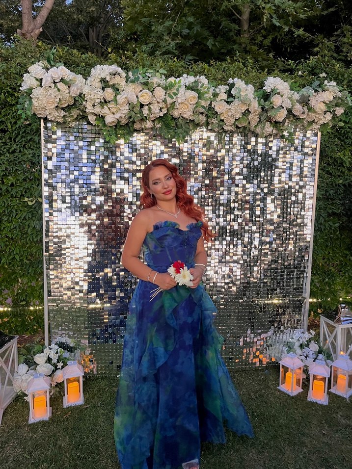 Parlak detaylı, mavi tonlarında, straplez yakalı ve ince askılı, bağlama desenli uzun bohem elbise. Straplez yaka, göğüs gloplu, balen korseli, sırtı ip bağlama detaylı, volanlı, içi rengine uyumlu astarlı, kadın renkli uzun abiye elbise. ✨ 38-40 uyumlu