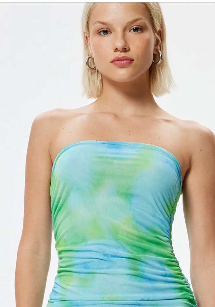 Mavi ve yeşil tonlarda batik desenli, straplez ve drapeli mini elbise. Yumuşak sentetik kumaştan üretilmiş, kolsuz ve vücuda oturan model, parti için uygun.