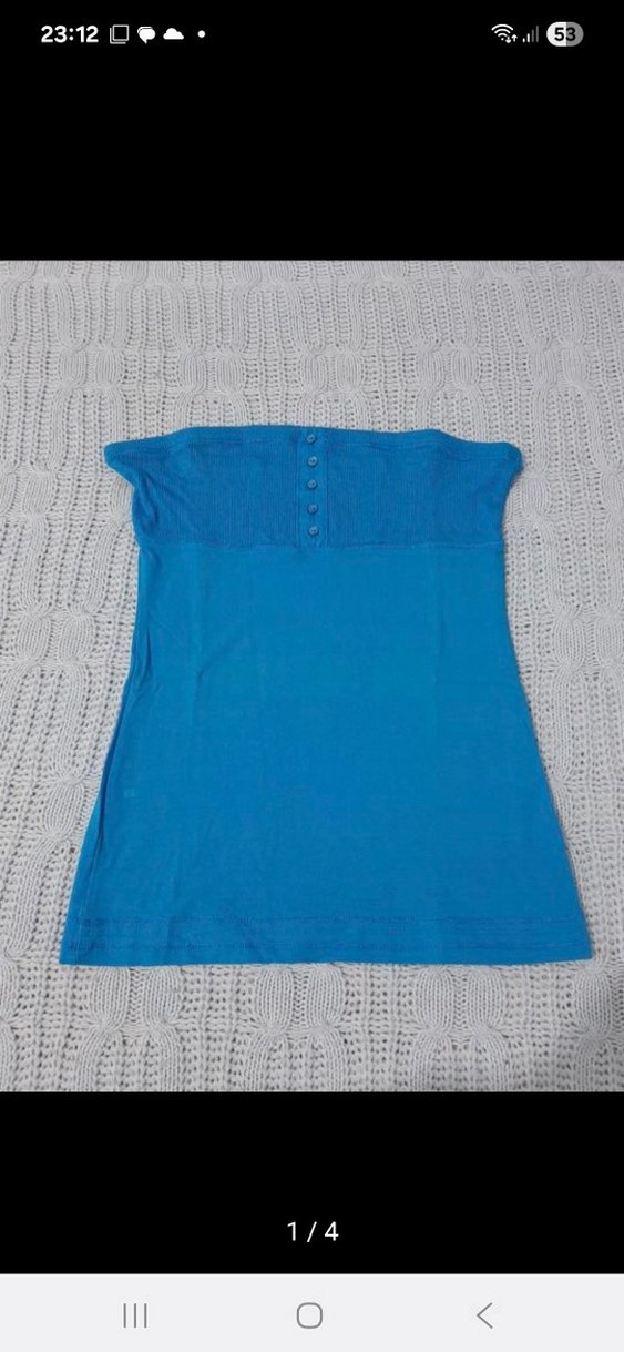 Mavi straplez, kolsuz bluz, Düğme detaylı, sade ve günlük kullanıma uygun bohem tarzda.