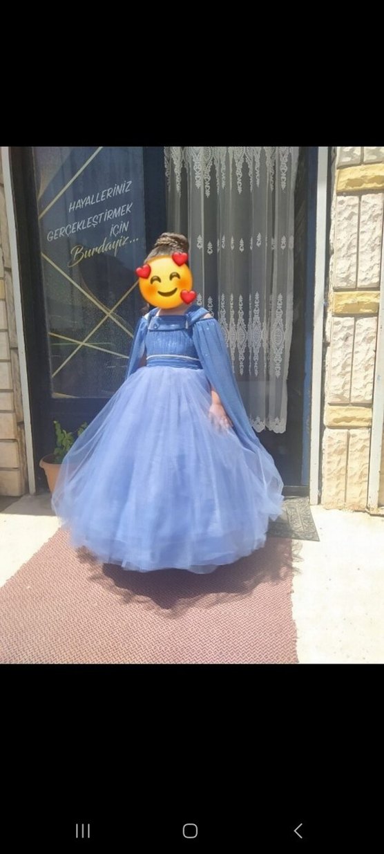 Mavi denimden yapılmış, straplez yaka ve fırfır detaylı, fitted kesim çocuk elbisesi. Gotik ve avangart tarzda, pastel tonlarda, desen içermeyen şık bir modeldir. "CIN, HAYALLERINIZ, GERCEKLESTIRMER" yazısı görünmektedir.
