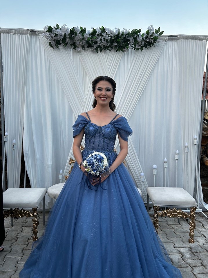 Mavi renkte, straplez yakalı, drapeli ve askılı kollu, etnik desenli uzun ve vücuda oturan abiye elbise.