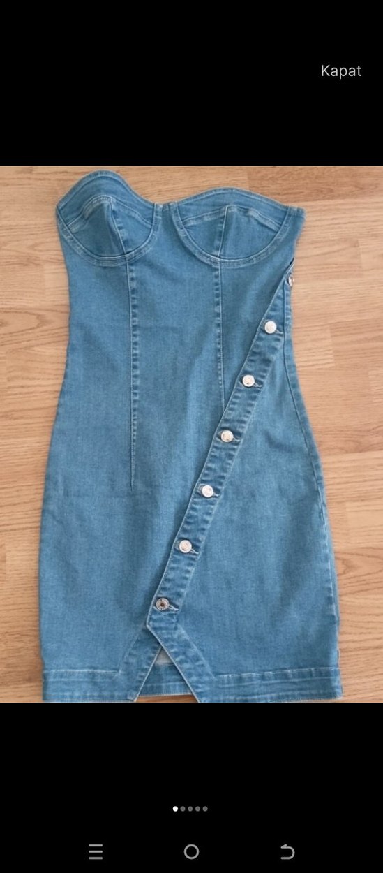 Bu mavi parlak kot kumaştan yapılmış, straplez ve düğmeli midi elbise, vücuda oturan kesimi ve kolsuz tasarımıyla gündelik sokak stiline uygundur.