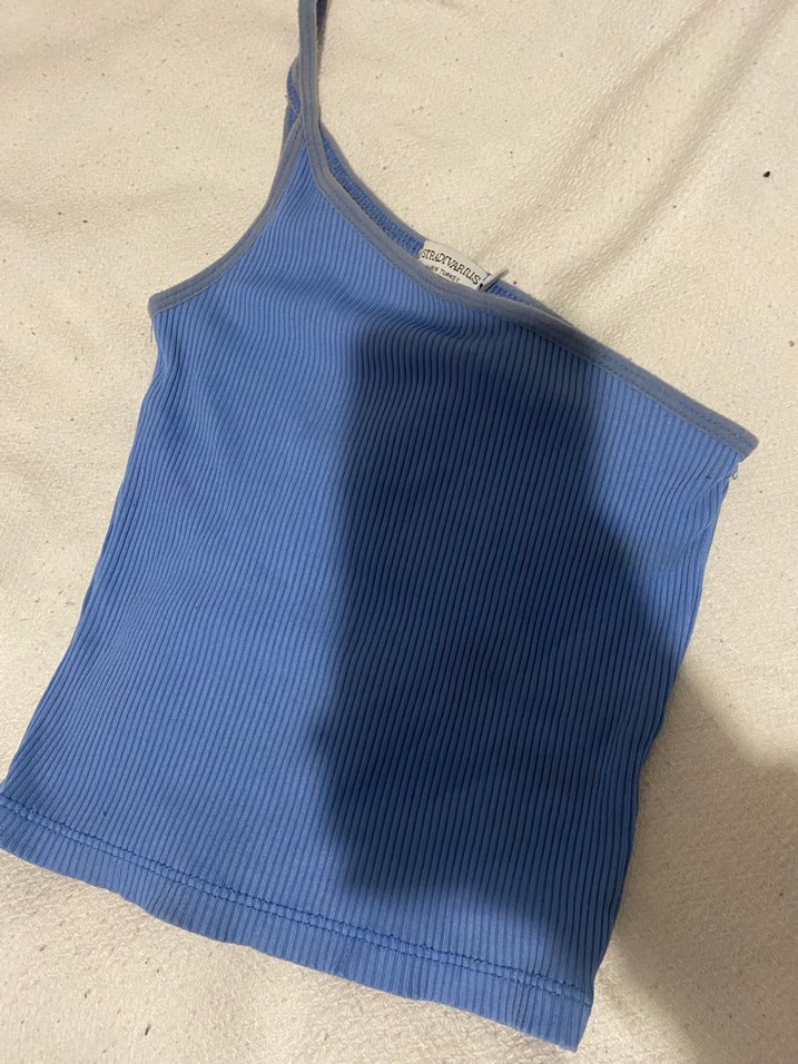 Mavi fitilli, straplez yaka ve kolsuz crop , yumuşak pamuk kumaştan üretilmiştir. Trendy ve rahat bir görünüm sunar.