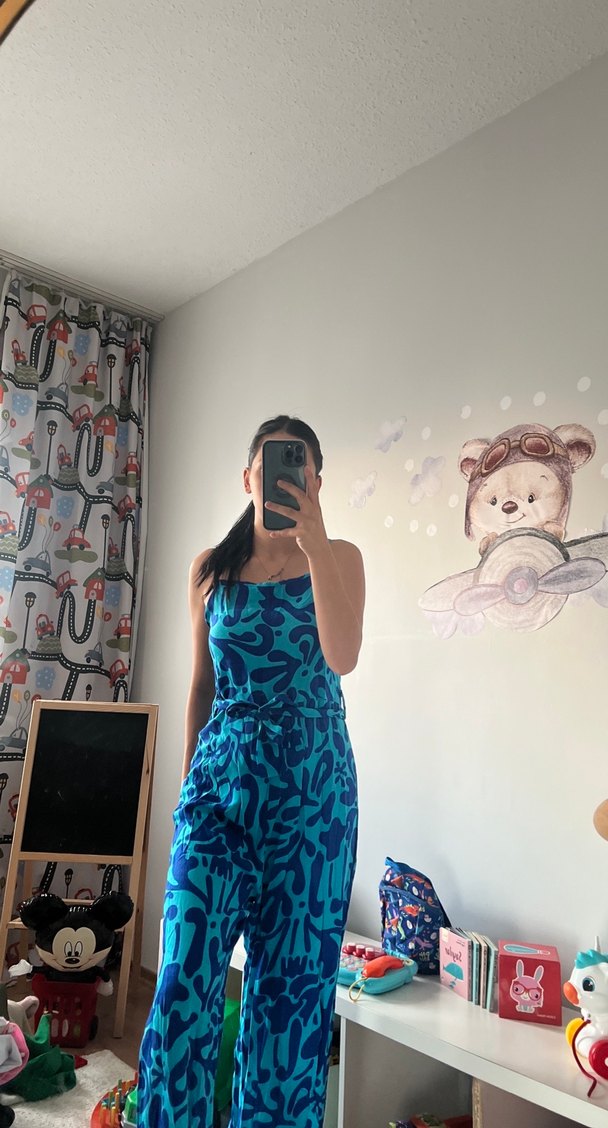 Straplez yakalı, midi boy hamile tulumu, koyu mavi tie-dye desenli ve şeffaf, ipeksi kumaştan. Minimalist, bohem sokak stili için ideal, kolsuz ve vücuda oturan kesim.