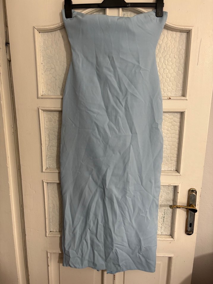 Keten kumaştan, uzun boy, straplez ve kolsuz tasarıma sahip, vücuda oturan kalem elbise. Drapeli ve desensiz, ofis kullanımı için uygun minimal tarzda.