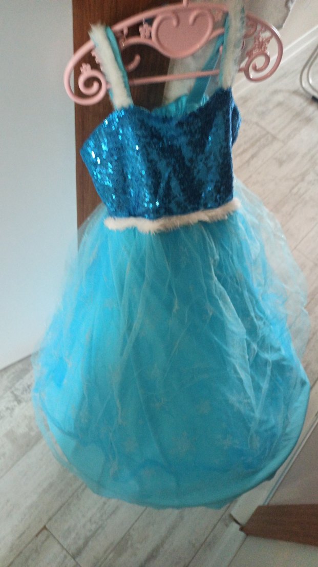 Mavi straplez, simli ve volan detaylı üst kısmı, hafif dökümlü sentetik kumaş etekli kız çocuk abiye elbise. Askılı ve renkli, desensiz tasarım ✨ #elsa kostümü #cocukabiye #abiye #elsa