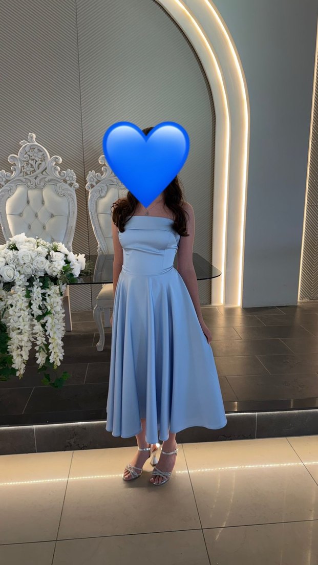 Fitted kesim, mavi pastel renkli straplez ve drapeli detaylara sahip bu nişan elbisesi, modern klasik ve Paris tarzını yansıtır.
