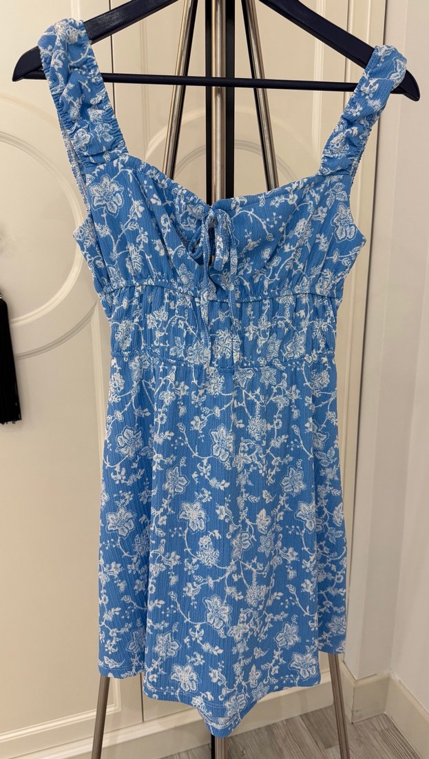 Mavi pastel tonlarda, straplez yakalı ve fırfırlı detaylı, bohem tarzda, dış mekan kullanıma uygun, ince kesim midi elbisedir.