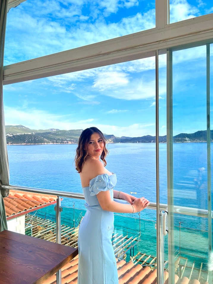 Fitted kesim, pastel mavi denim kumaşlı midi elbise, straplez yaka ve ince askılarla. Şeffaf detaylı, desen içermeyen sade tasarım. Günlük kullanım için uygun.
