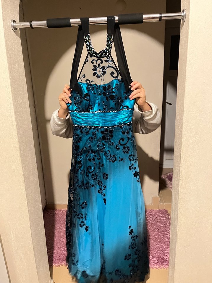 Mavi, straplez yaka ve drapeli tasarıma sahip, oturan kesim midi elbise. Siyah çiçek desenli batik deseni ve askılı kollarıyla dikkat çeker. Parti için uygun.