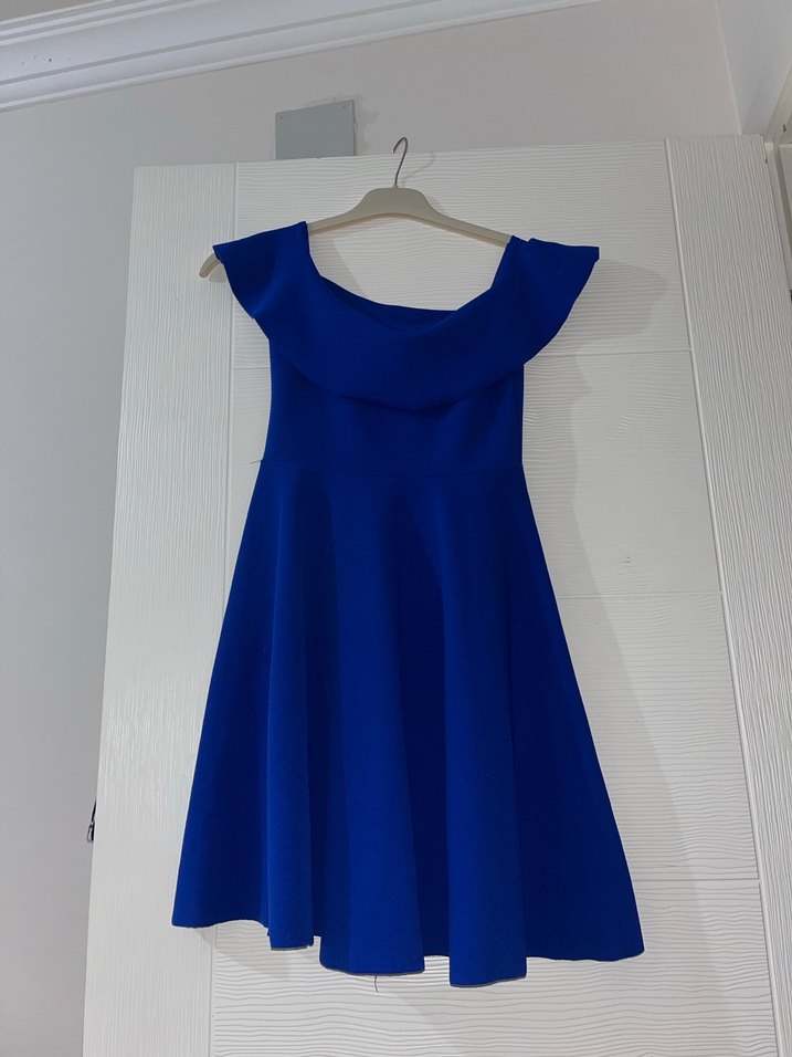 Parlak mavi midi elbise, straplez yaka ve fırfır detaylarıyla modern klasik ve minimalist tarzı bir araya getirir. Salaş kesim, günlük kullanım için uygun.