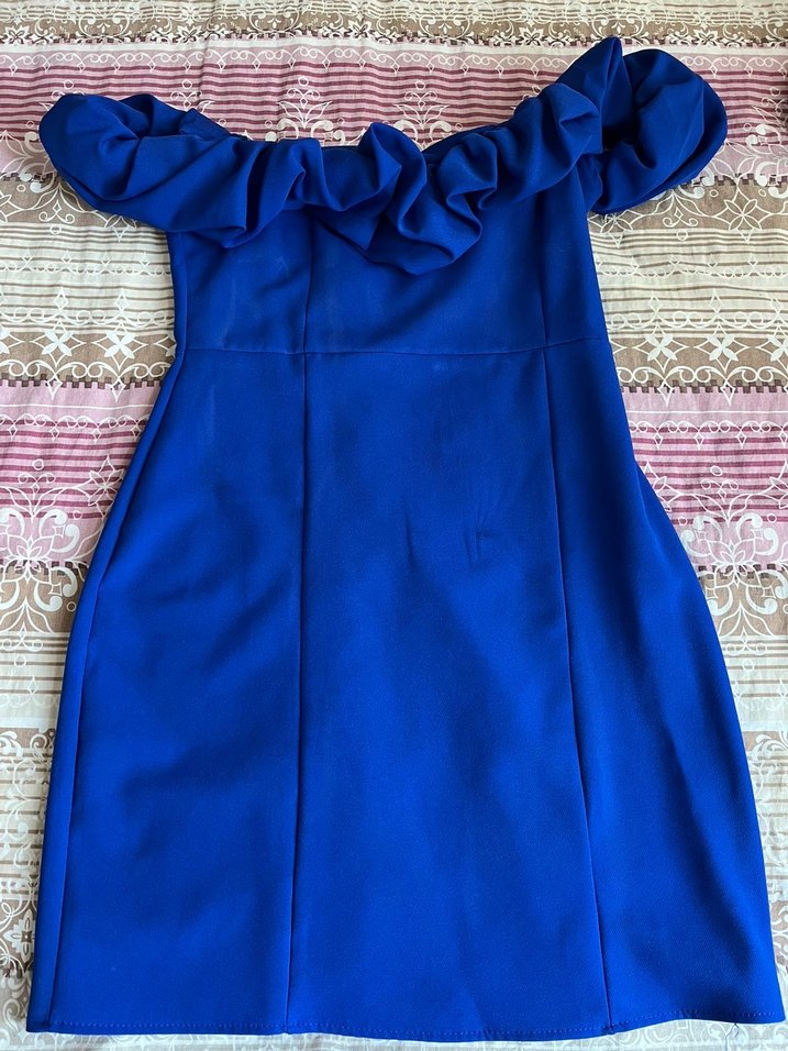 Mavi renkli, straplez midi elbise, volan detaylı ve vücuda oturan kesime sahiptir. Kolsuz ve parti için uygundur, bohem ve Paris tarzını yansıtır. Temiz ürün marka temsili