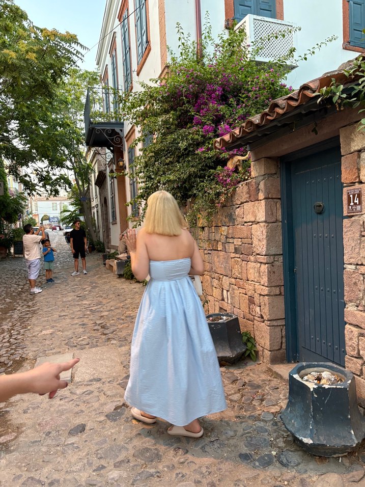 Yumuşak mavi kot kumaştan, straplez ve yırtmaçlı, bol kesim midi elbise. Bohem tarzda, düğün için uygun.