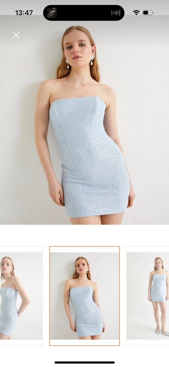 İnce askısız, mavi mini elbise, vücuda oturan kesimi ve boncuk işlemeleriyle parti için uygundur. Mezuniyet için almıştım şimdi satıyorum elbise çok güzel boyu ayarlanabilir artık satışta yok