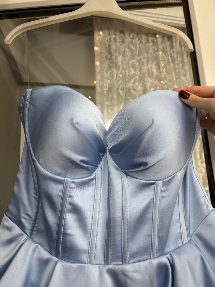 Pastel mavi renkli, straplez ve düğmeli detaylı mini abiye elbise. Kısa boyu ve çağdaş tasarımıyla göz alıcı parti kıyafeti.
