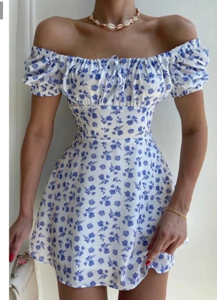 Straplez yaka, kısa kollu, dökümlü tasarıma sahip mavi pastel tonlarda batik desenli, sentetik kumaştan mini çiçekli elbise.