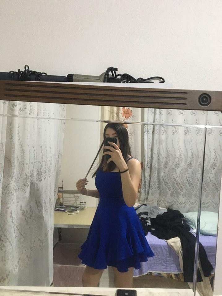 Parlak mavi, straplez ve askılı kollu, transparan detaylı dar kesim elbise. Gotik tarzıyla cesur parti kombinleri için ideal. Midi boy ve minimalist tasarım.