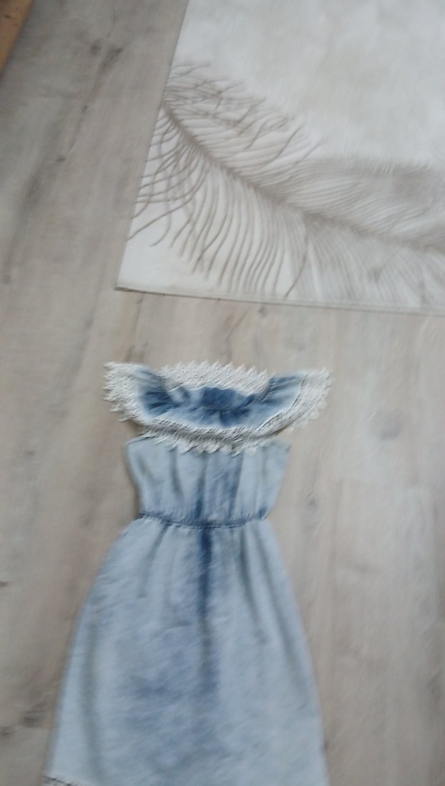 Pastel nakışlı desenli, straplez yaka ve fırfırlı mavi denim elbise. Bohem tarzda, kolsuz ve normal boyda, günlük kullanıma uygun.