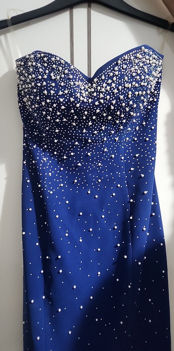 Bu mavi, straplez abiye elbise uzun boyu ve parlak payet detaylarıyla, çağdaş baskılı desende, göz alıcı ve şık bir tercihtir. ✨