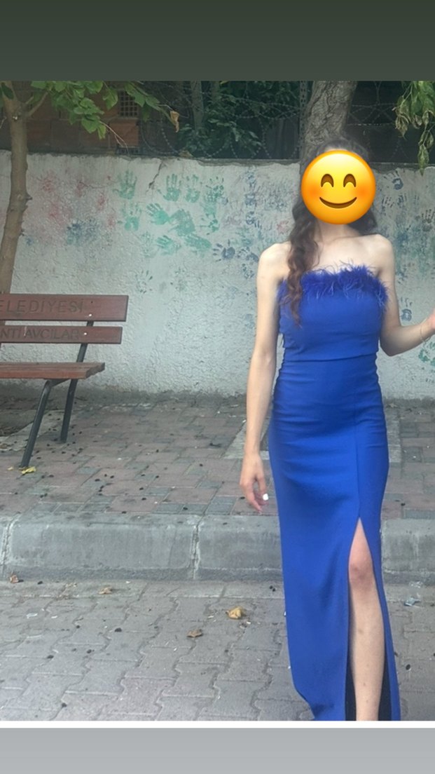 Parlak mavi kumaşlı, straplez ve uzun abiye elbise, yırtmaç ve askılı detaylarla avant-garde parti tarzına uygun. ✨