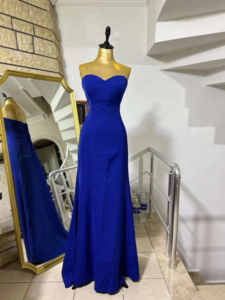 Mavi renkli, straplez yaka ve drapeli detaylara sahip uzun abiye elbise. Klasik ve modern tarzı, düğün gibi özel günler için uygun şık bir seçimdir. 36-38-40 bedenler için uygundur.