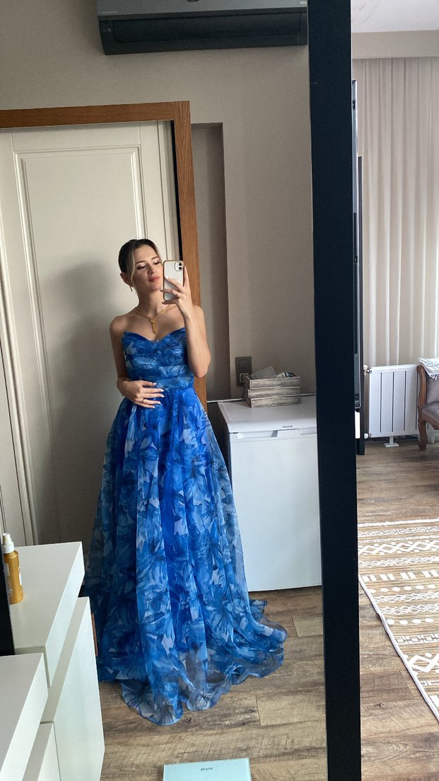 Mavi, straplez abiye elbise, vücuda oturan üst kısmı ve uzun, dökümlü etek kısmıyla dikkat çeker. Transparan detayları ve batik desenleri bohem bir hava katarken, şık ve zarif bir görünüm sunar.