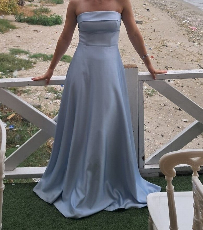 Uzun, straplez mavi elbise, vücuda oturan üst kısmı ve drapeli etek detayıyla düğünler için klasik ve modern bir görünüm sunar. Kolsuz tasarımı ve pastel tonu şıklık katıyor.