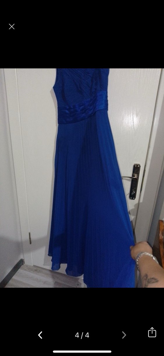 Koyu mavi renkte, straplez ve drapeli detaylara sahip, uzun ve dökümlü etekli, klasik şıklıkta abiye elbise. Kollu değil, desensiz ve dar kesim.