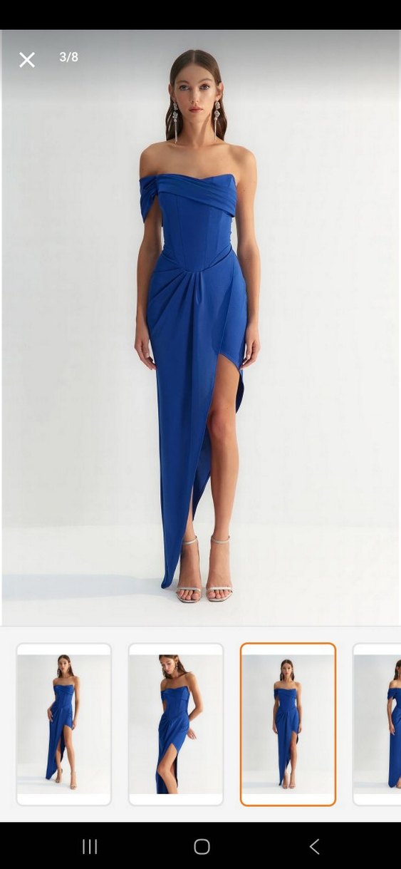 Bu mavi straplez uzun elbise, drapeli tasarımı ve ipeksi dokusuyla dikkat çeker. Sıkı kesimi, ince askıları ve yırtmaç detayıyla modern bir parti elbisesidir.