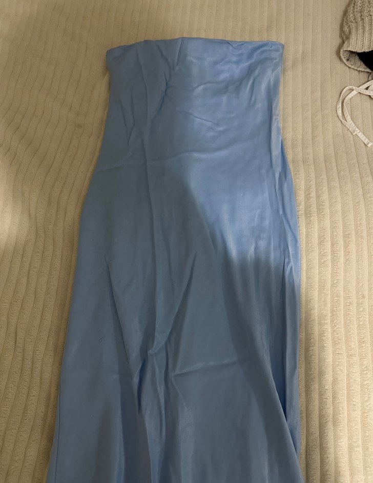 Mavi pastel tonlarda, straplez yaka ve drapeli tasarıma sahip, uzun ve vücuda oturan elbise. Sentetik kumaştan, minimal tarzda, kolsuz ve desensizdir.