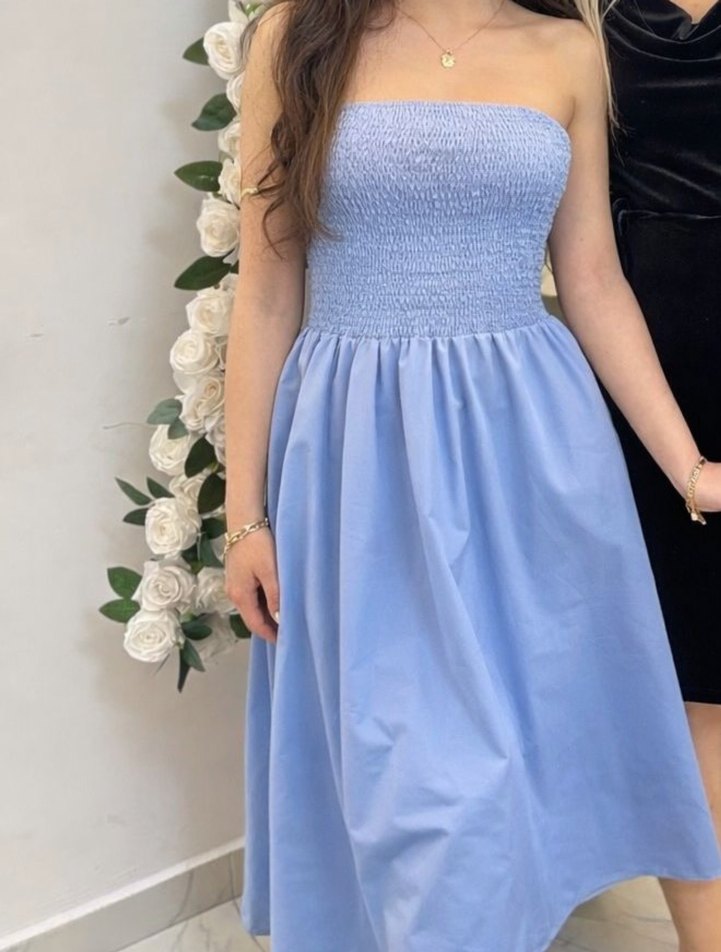 Pastel mavi, straplez, elbise. Günlük ve düğün için uygun.