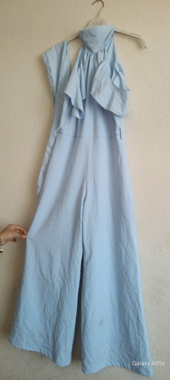 Yumuşak keten kumaştan, mavi pastel renkte, drapeli ve kolsuz, bol kesim straplez uzun tulum. 12 13 yaş 158 boy