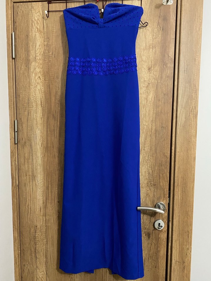 Mavi Straplez Yakası Taşlı Uzun Abiye Elbise