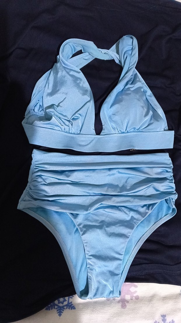 Mavi renkli, askılı ve vücuda oturan bikini takımı, midi boy altıyla plaj ve sokak modasına uygun şık bir görünüme sahiptir.