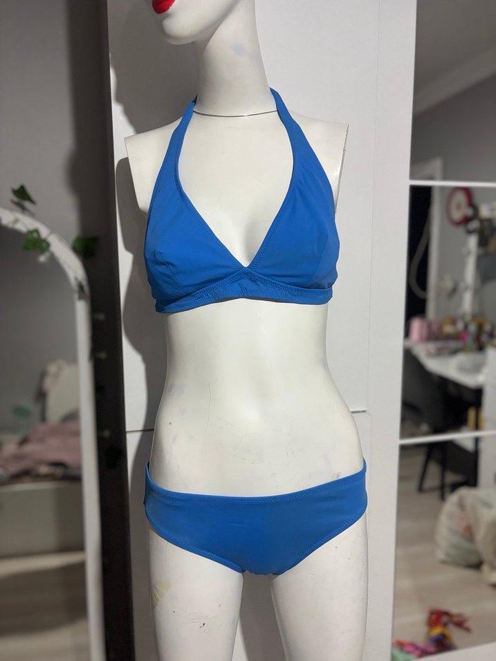 Mavi renkli, strappy askılı ve modern tasarımlı, desen içermeyen bu bikini takımı, şık ve rahat bir plaj görünümü sunar.