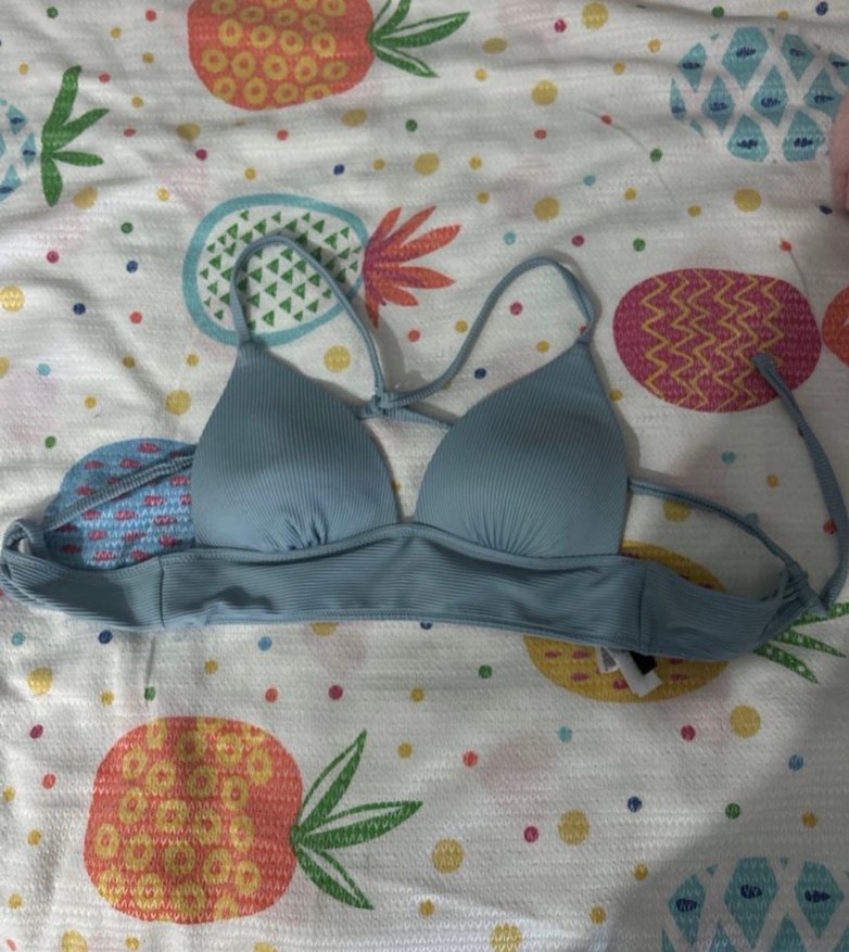 Mavi renkli, strappy askılı, düğmeli ve bohem athleisure tarzını yansıtan fit kesim bikini üstü.