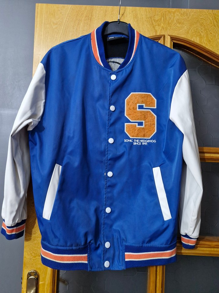 Parlak mavi sentetik kumaştan, beyaz deri ve hasarsızkollu, çıtçıtlı , baskılı, regular fit street wear ceketi.