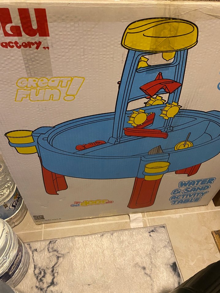 Mavi renkli, dönen su çarkları ve rampalar içeren eğlenceli bir su oyunu masası. Bütün parçaları eksiksiz şekilde içinde yepyeni