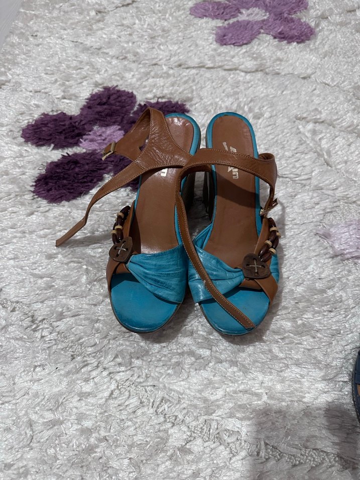 Mavi süet dolgu topuklu, bağlamalı ve tokalı kadın ayakkabısı, bağlama desenli. Bohem ve minimalist tarzı günlük kullanıma uygun.
