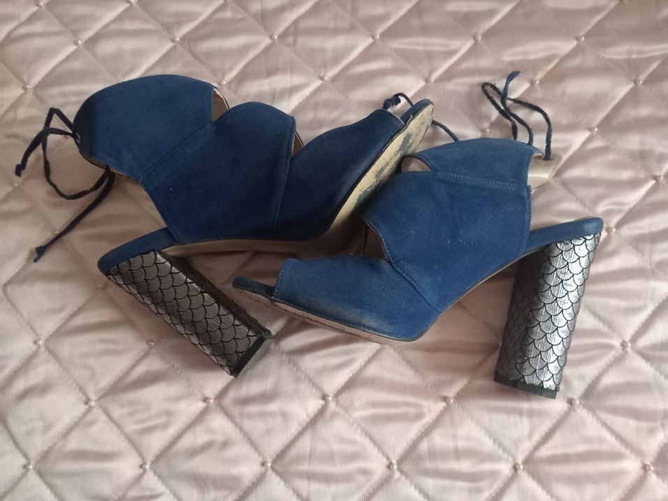 Kadınlar için mavi süet, bağlamalı ve kalın topuklu akşam ayakkabısı. Minimalist bohem tarzına uygun, romantik akşamlar için ideal.