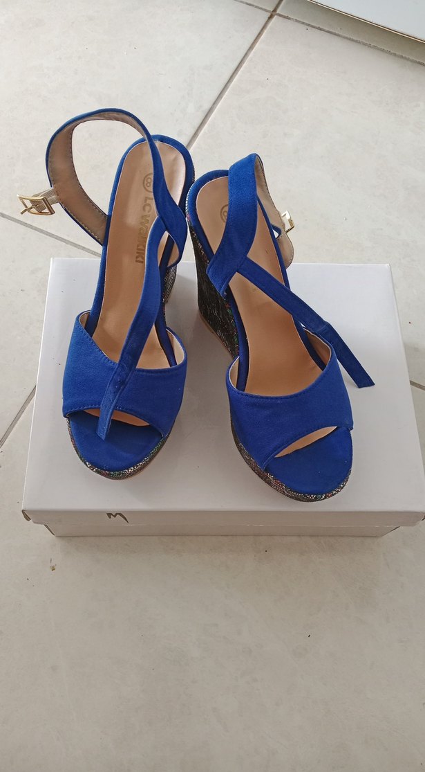 Mavi süet dolgu topuklu ayakkabılar, parlak yılan deseniyle. Tokalı kayışlar günlük kullanım için çağdaş bir görünüm sunar.
