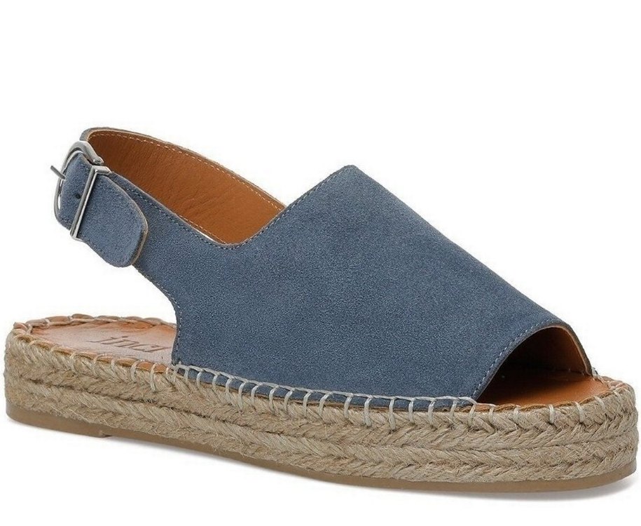Mavi süet dolgu topuklu espadril, tokalı kayışlı ve doğal dokuma tabanlı. Minimalist bohem tarzda günlük kullanım için uygundur.