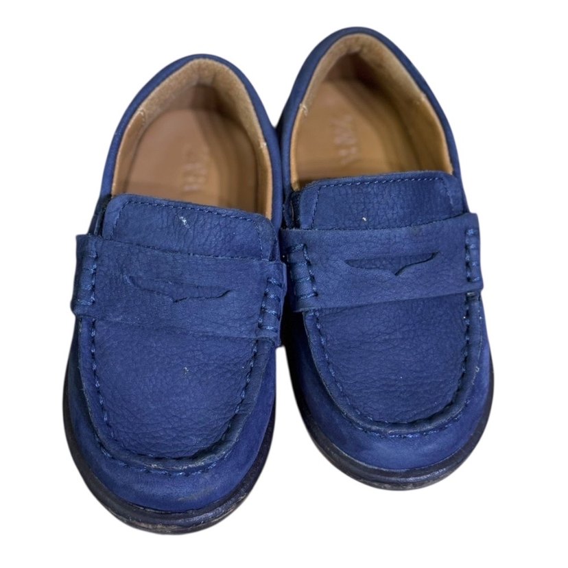 Mavi süet erkek çocuk ayakkabıları, sade tasarımı ve tokalı detayıyla sokak stiline uygun yumuşak dokulu koyu renklidir.