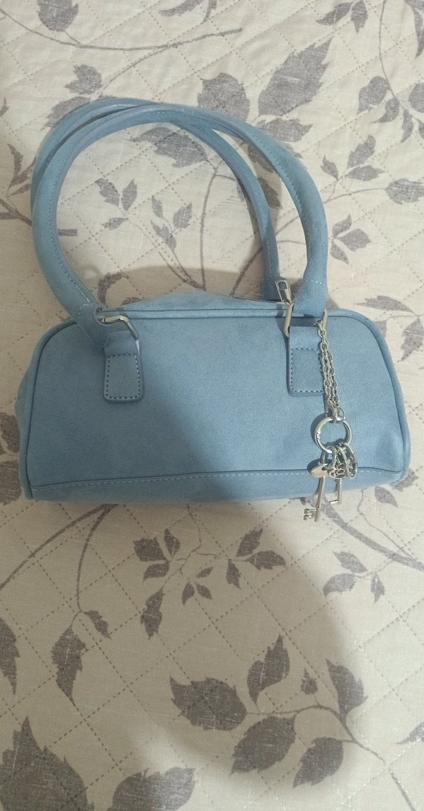 Pastel mavi renkli, süet dokulu, tokalı kadın çantası. Minimalist ve bohem tarzıyla günlük kullanıma uygun, şık ve rahat bir model. yeterince iç kısmı büyük ve cepli bir model hiç kullanılmadı