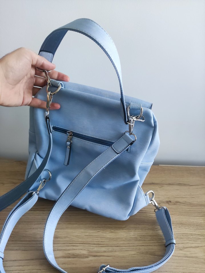 Pastel mavi süetten yapılmış, fermuarlı ve minimalist tarzda, günlük kullanıma uygun kadın sırt çantası. Çok az kullanılmıştır. Çantanın boyu 28 yükseklik 25 genişlik 15 derinlik